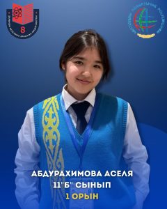 Олимпиаданың жеңімпазы және I дәрежелі диплом иегері – 11 «Б» сынып оқушысы Абдурахимова Аселя (мұғалімдері Игликова Г.К., Осипенко А.М., Сүлейменов Р.Х.).