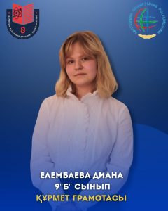 Құрмет грамотасымен 9 «Б» сынып оқушысы Елембаева Диана марапатталды (мұғалімдері Нұрханова А.С., Шевченко И.И., Сүлейманова А.В.).