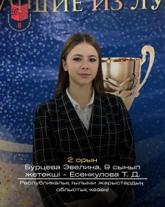 Бурцева Эвелина, 9 сынып — жетекші Есенкулова Т.Д.