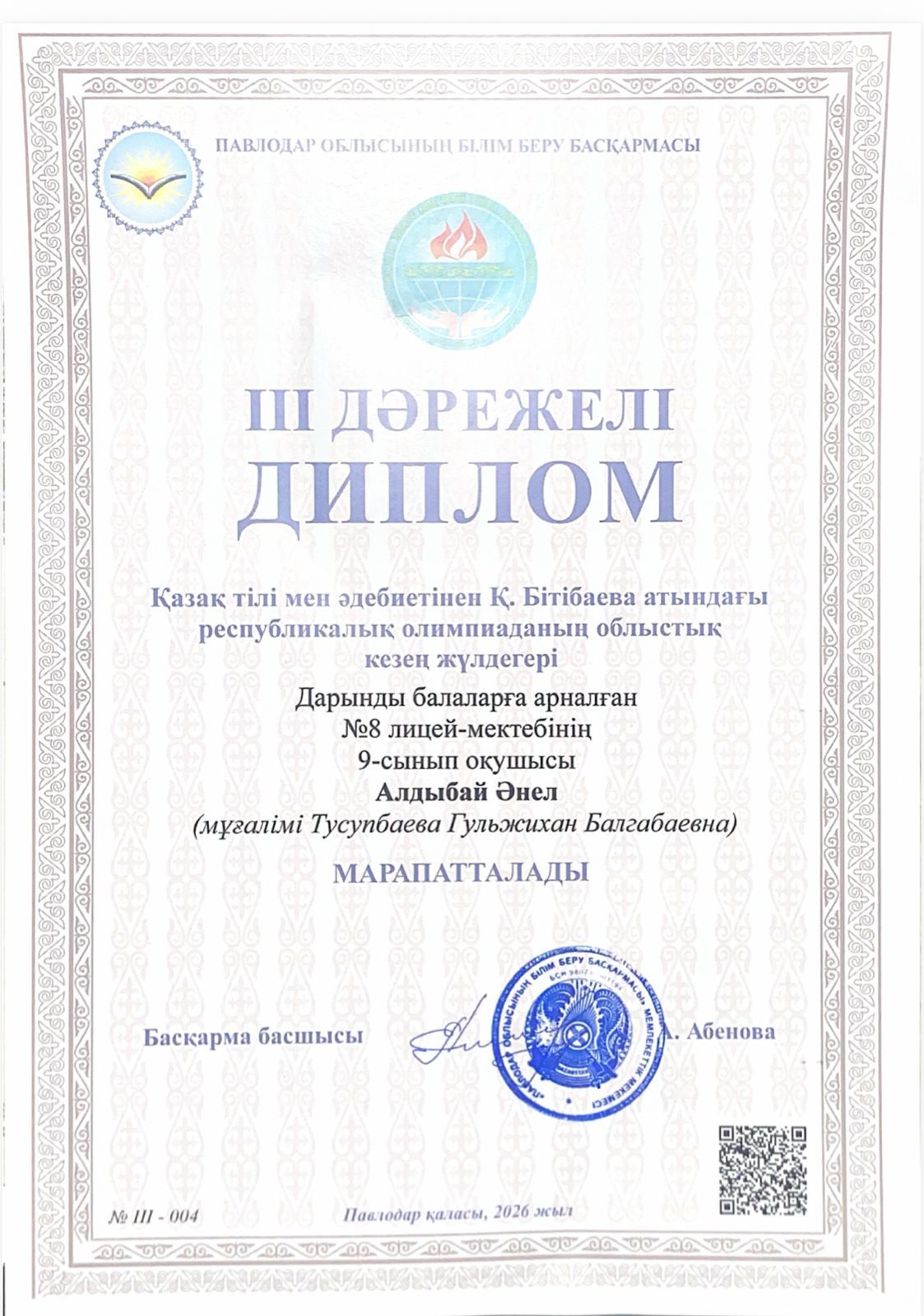 Бүгін қазақ тілі мен әдебиетінен Қ. Бітібаева атындағы республикалық олимпиаданың облыстық кезеңі өтті. Олимпиадаға біздің лицейден 9 “Ә” сынып оқушысы *Алдыбай Әнел* қатысып, ІІІ дәрежелі дипломмен марапатталды.
